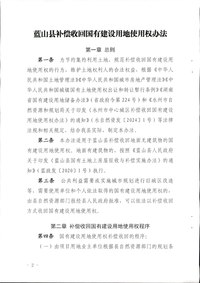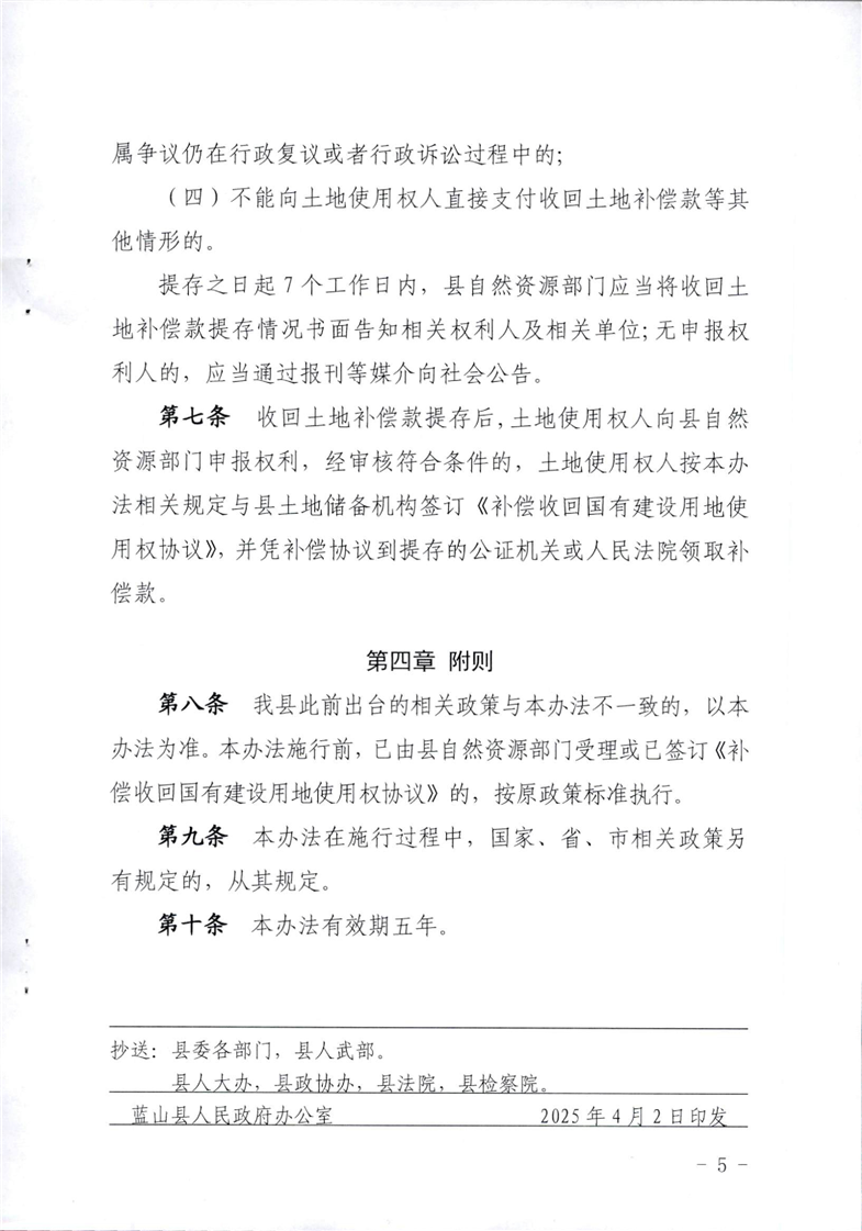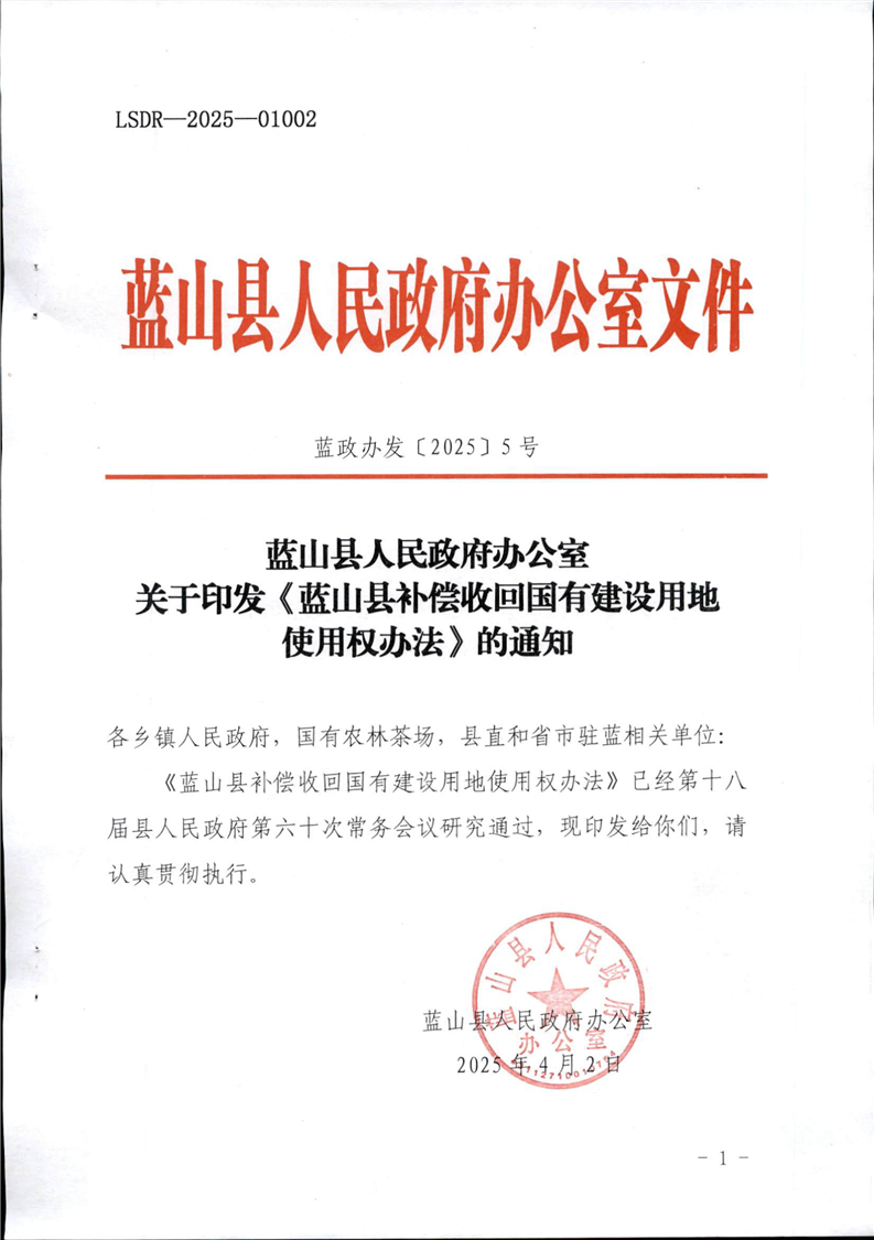 蓝山县人民政府办公室关于印发《蓝山县补偿收回国有建设用地使用权办法》的通知(蓝政办发〔2025〕5号)