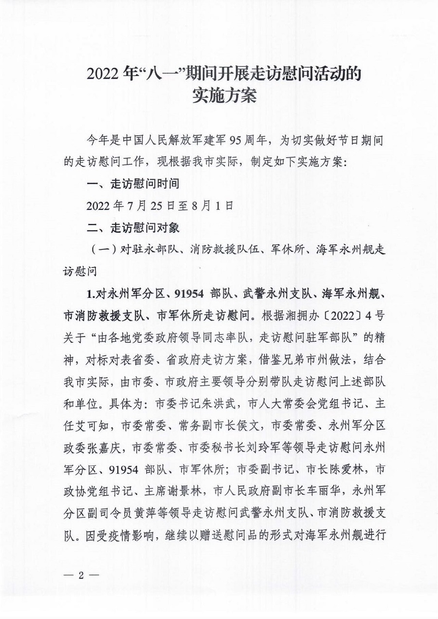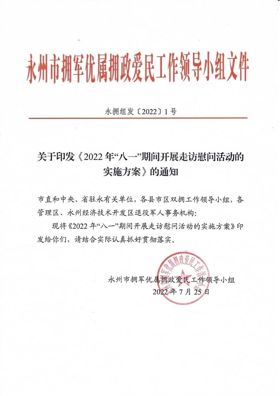 关于印发《2022年“八一”期间开展走访慰问活动的实施方案》的通知