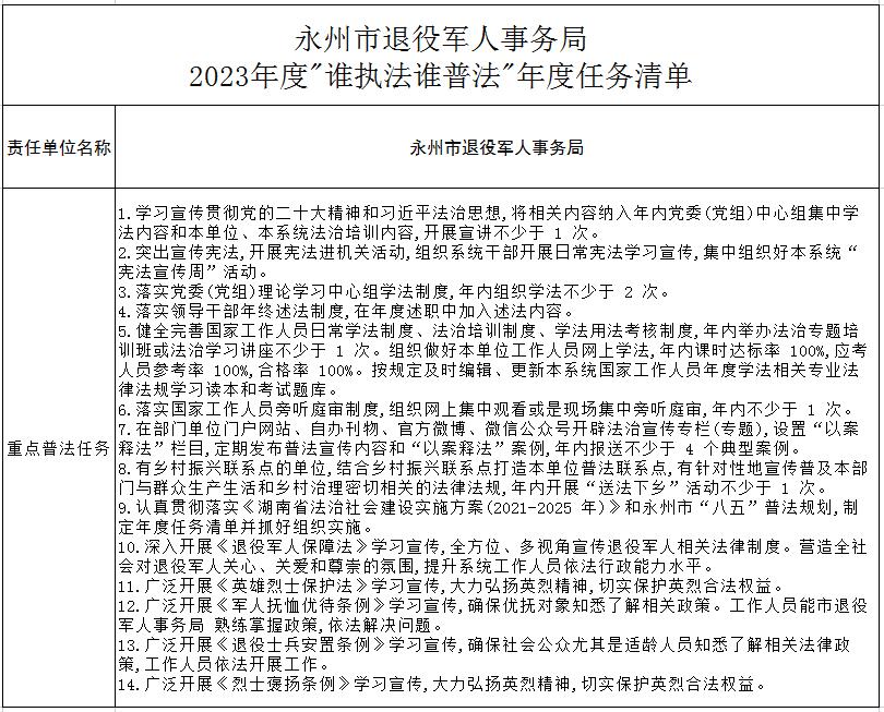 永州市退役军人事务局2023年度"谁执法谁普法"年度任务清单