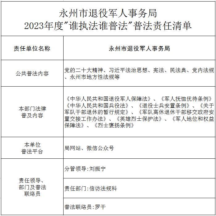 永州市退役军人事务局2023年度"谁执法谁普法"普法责任清单和年度任务清单公示