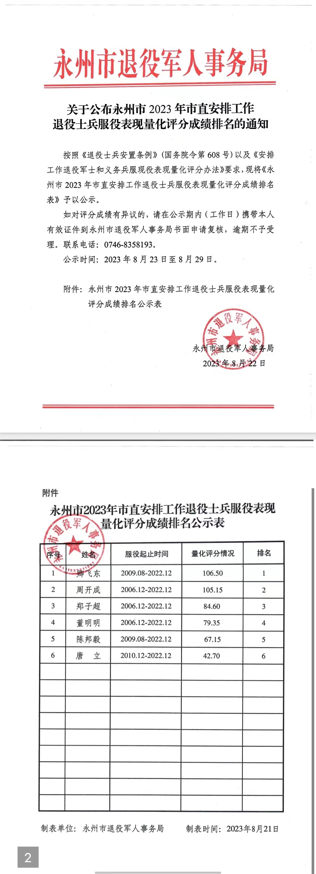 关于公布永州市2023年市直安排工作退役士兵服役表现量化评分成绩排名的通知
