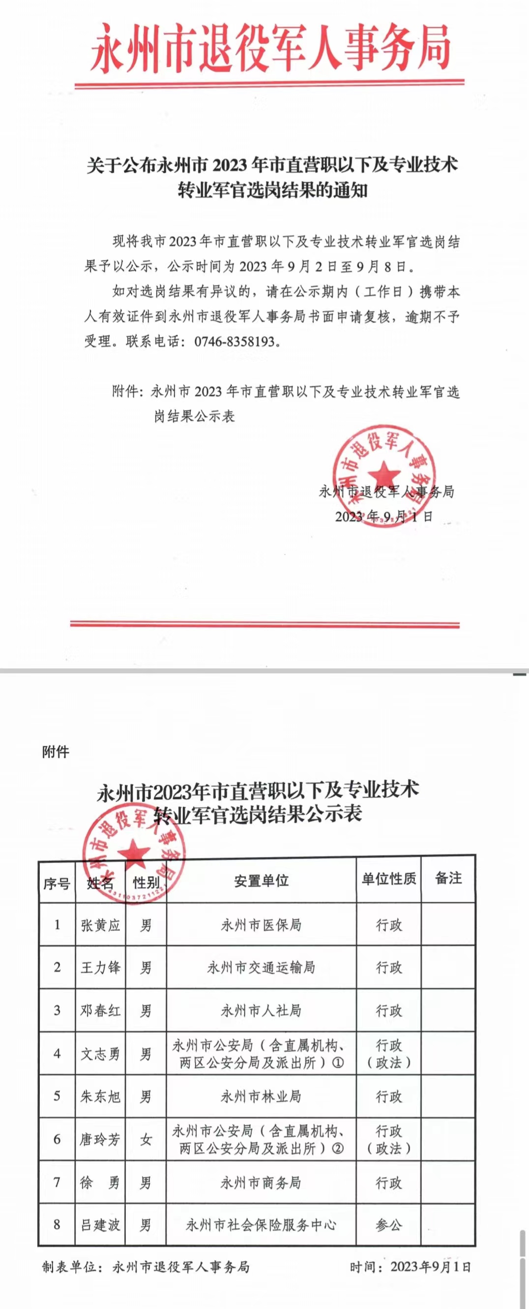 永州市2023年市直营职以下及专业技术转业军官选岗结果公示