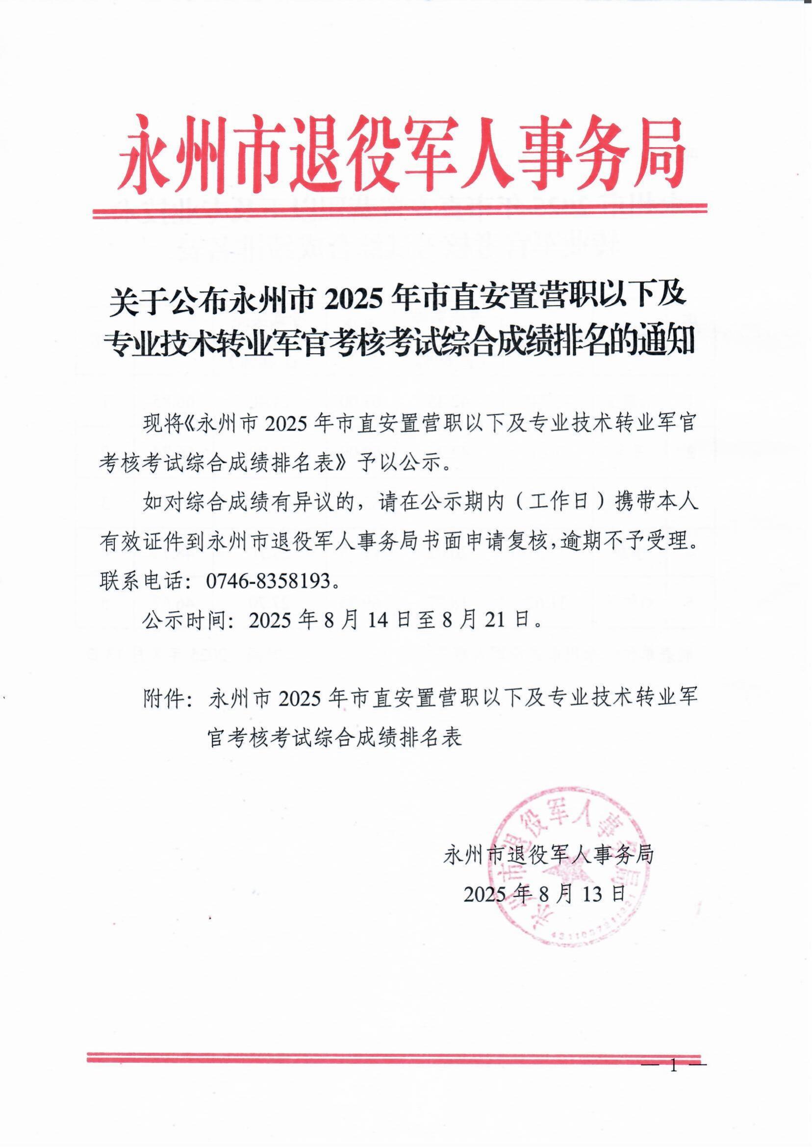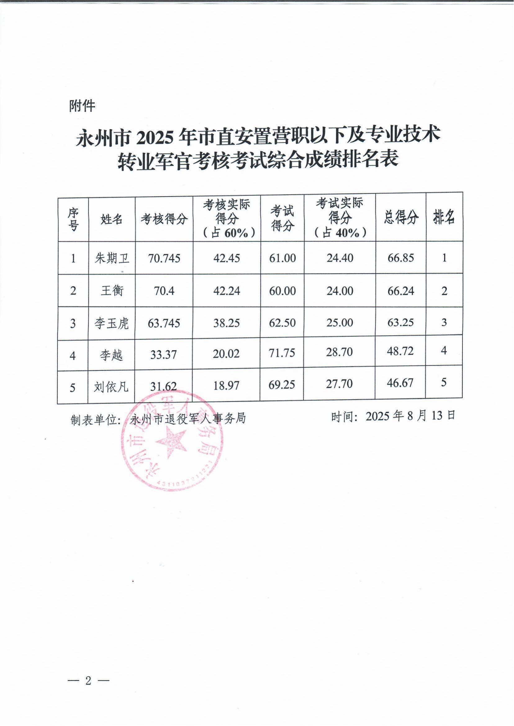 关于公布永州市2025年市直安置营职以下及专业技术转业军官考核考试综合成绩排名的通知