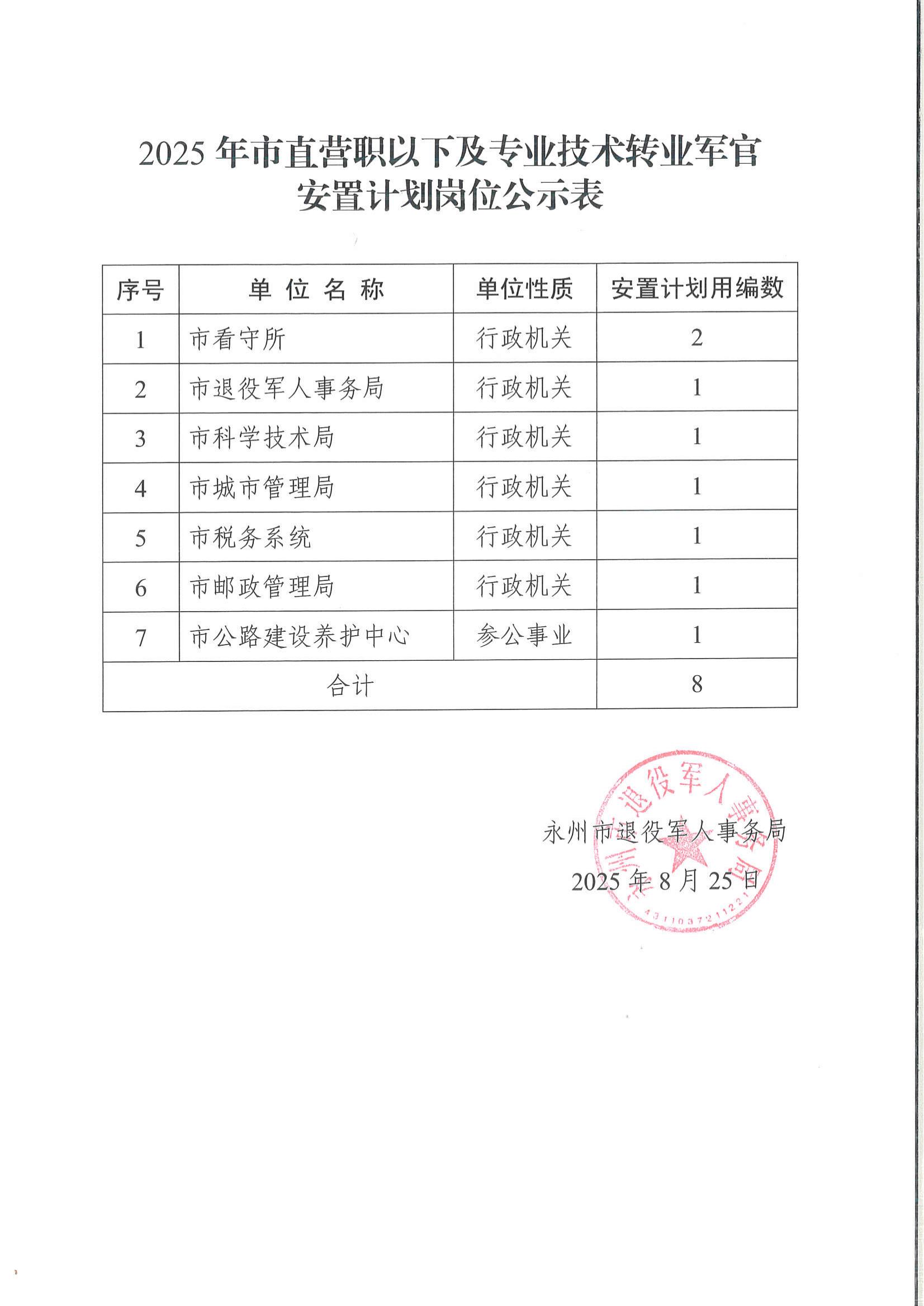 2025年市直营职以下及专业技术转业军官安置计划岗位公示表