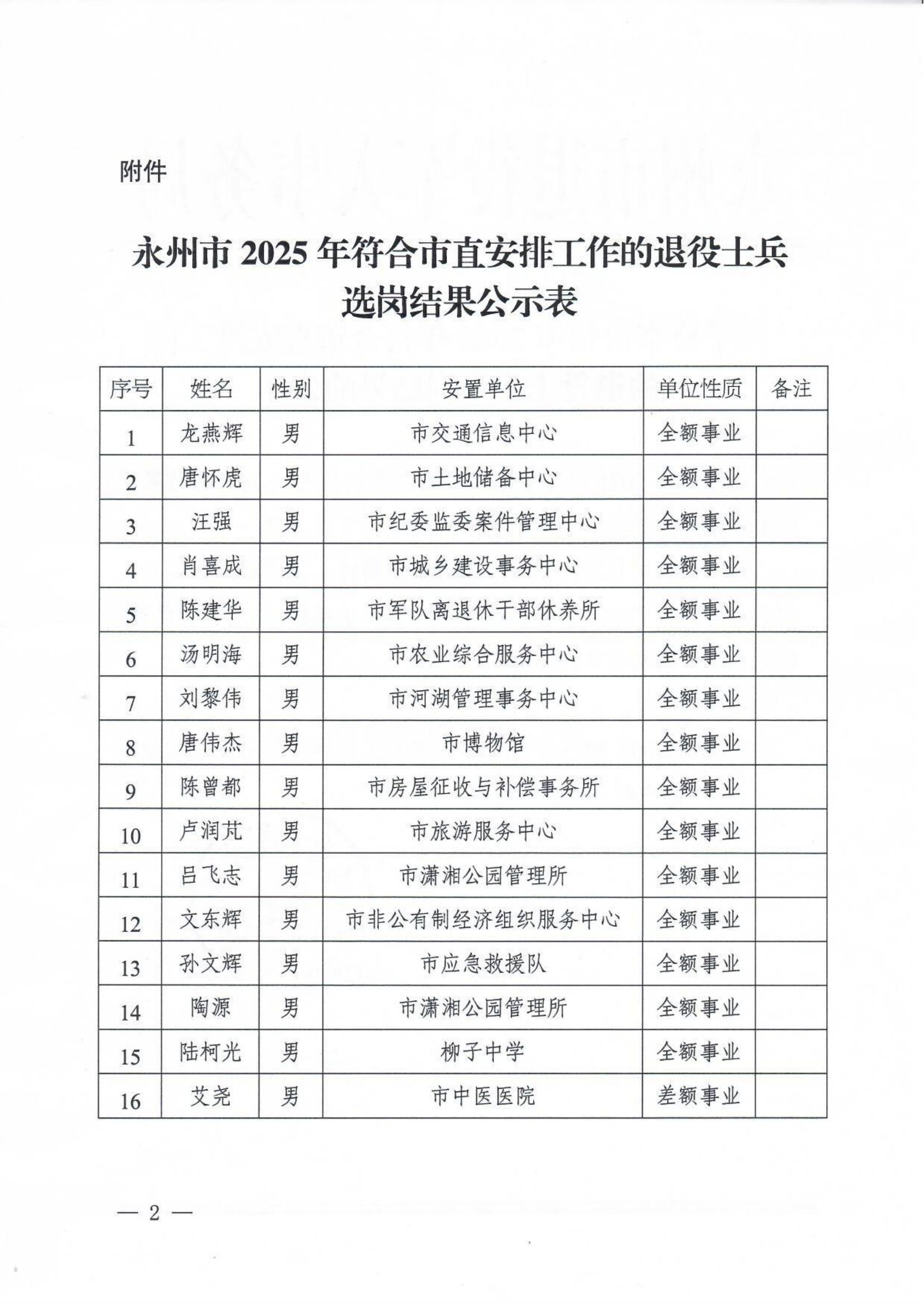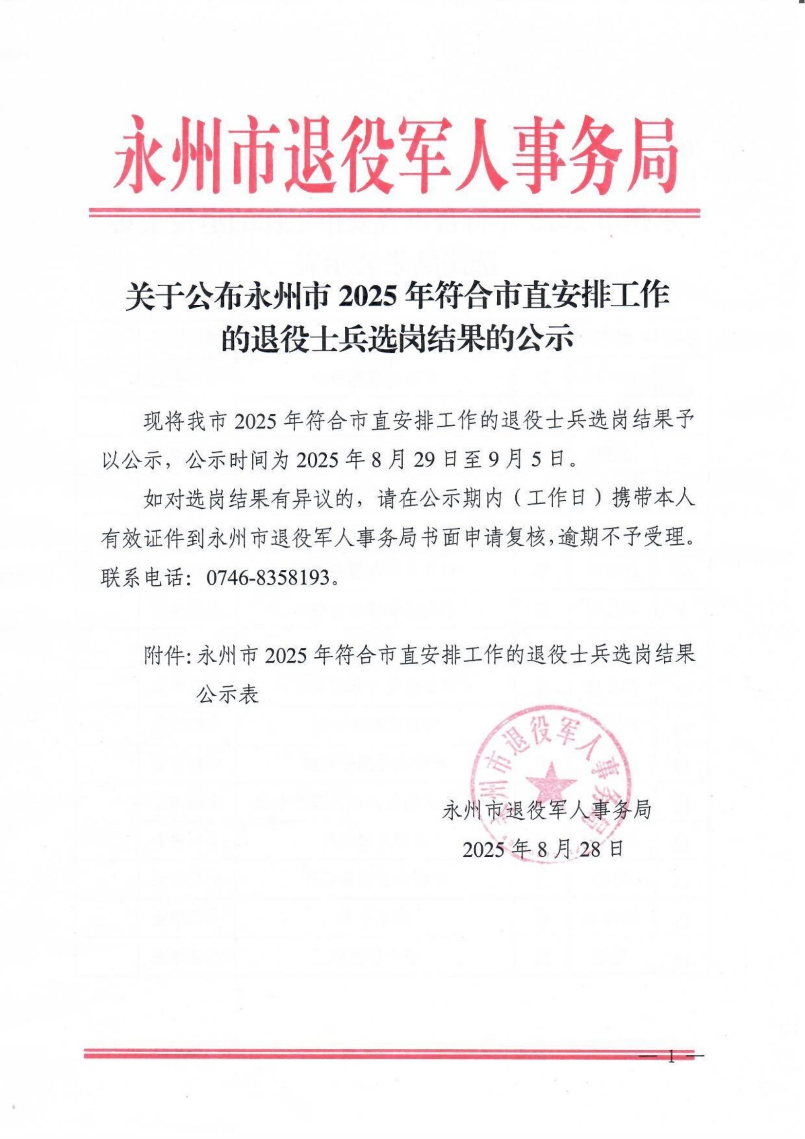 关于公布永州市2025年符合市直安排工作的退役士兵选岗结果的公示