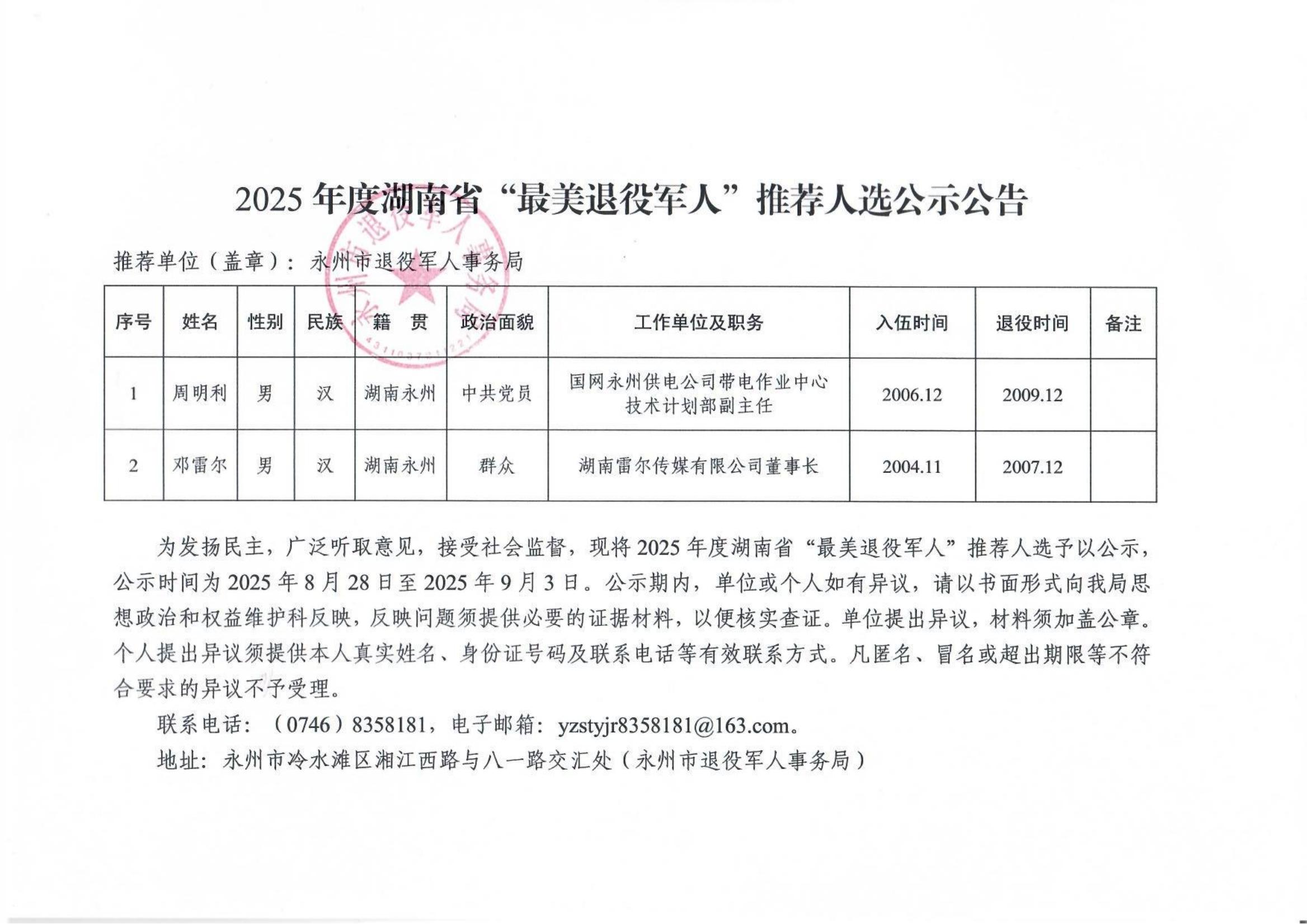 2025年度湖南省“最美退役军人”推荐人选公示公告