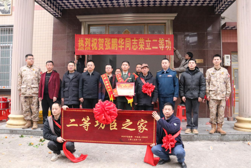 为军属佩戴绶带和大红花、宣读立功事迹、悬挂“二等功臣之家”牌匾……现场仪式喜庆热烈,由县人武部、县退役军人事务局以及镇、村相关负责同志组成的联合工作组郑重地将立功喜报和荣誉金送到军属手中,引来左邻右舍乡亲的驻足围观,大家纷纷拿起手机拍照,共同见证军人军属的荣光时刻。
