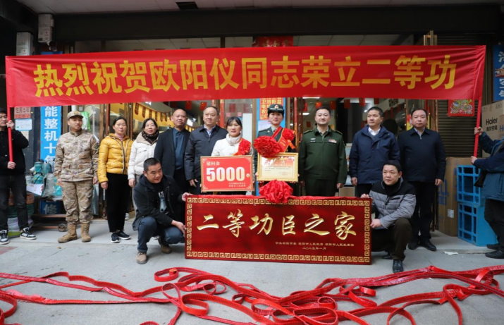 近日,祁阳市委常委、政法委书记章乐与国防科技大学相关领导带领市退役军人事务局、市人武部组成送喜报分队,为欧阳仪及其家属送去“二等功”荣誉。
