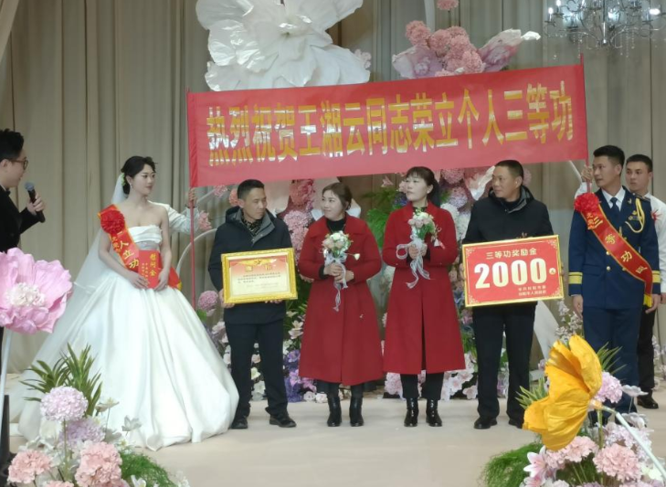 近日,祁阳市退役军人事务局和市人武部组成的送喜报队伍,敲锣打鼓地来到现役军人王湘云的婚礼现场,为功臣及家属佩戴大红花、绶带,送上了喜报、奖励金和新婚祝福,为婚礼添喜,也将这份喜悦分享给了在场的每位宾客。