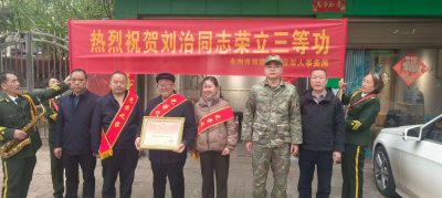 在林峰社区,报喜团为刘治家属佩戴红花绶带并亲切交谈,感谢军属为部队培养输送了优秀的战士,鼓励军人在部队再立新功。刘治在服役期间积极分享训练经验和技巧,帮助战士提升训练水平,带领连队出色完成多项重要任务,荣立三等功。