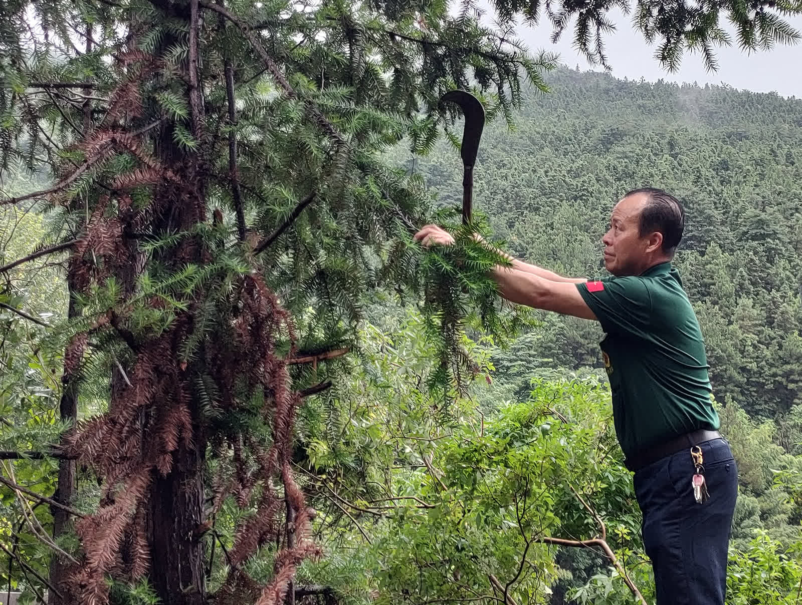 (图为唐生中在对杉树进行修枝抚育 杨万里 摄)