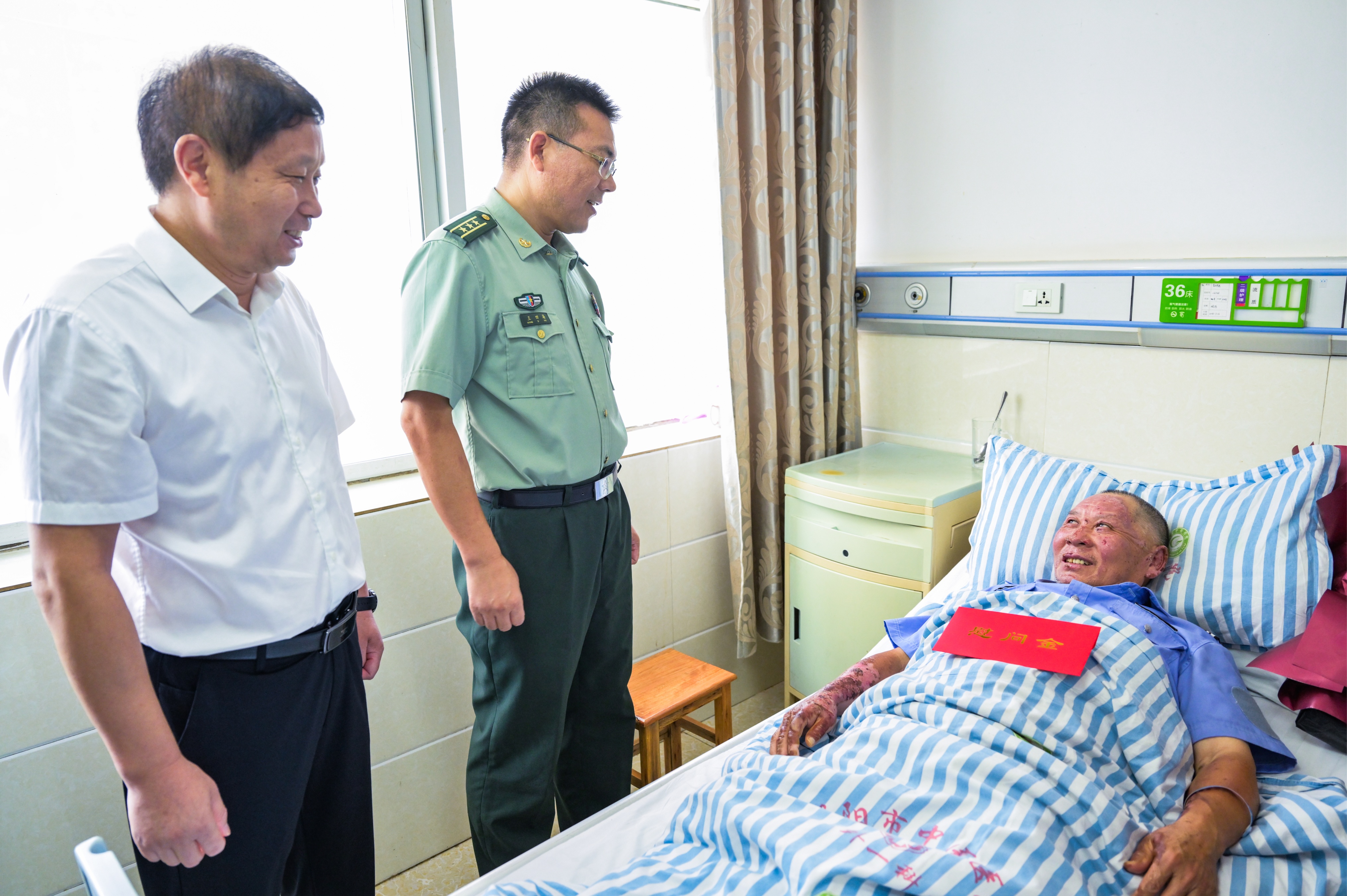 7月26日,永州市退役军人事务局副局长唐军华专程赴祁阳看望“见义勇为”获得者李祥选。这位退役军人保安在13天前勇闯火海救出3名儿童,因全身7%面积Ⅱ度至深Ⅱ度烧伤,目前仍在医院接受治疗。