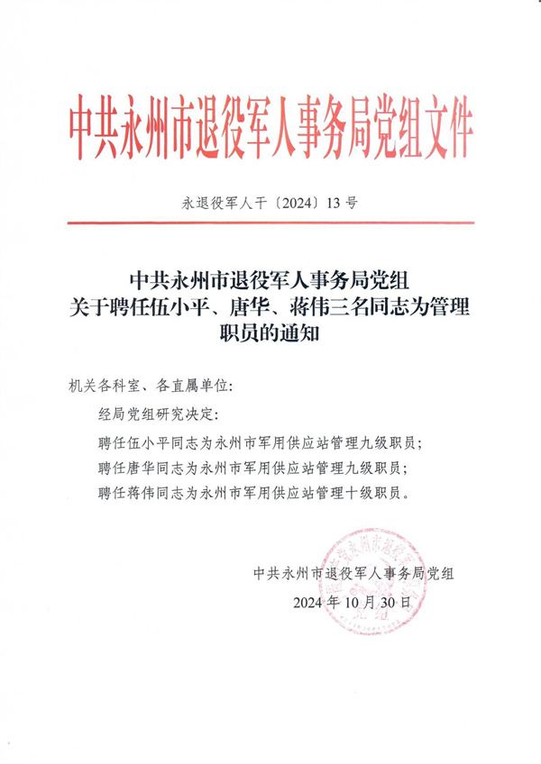 关于聘任伍小平、唐华、蒋华三名同志为管理职员的通知