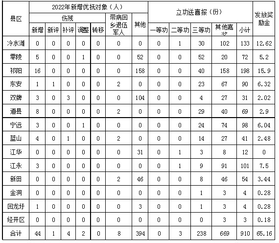 2022年1-6月,全市新增优抚对象454人,其中残疾军人、伤残人民警察、因公伤残人员、伤残预备役人员民兵民工的新增、新评、补评、调整、转移等52人,新评定带病回乡退伍军人8人,其他对象394人。为现役军人立功送喜报910人次,其中二等功3人,三等功238人,发放奖励金共计65万余元。