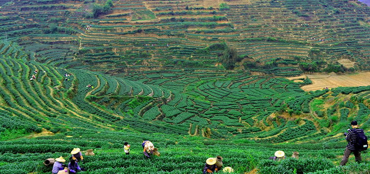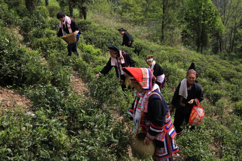 当天上午11点,高山茶林中仍然是一片繁忙的景象。瑶家阿妹冯爱凤竹篓中的嫩绿渐渐累了起来,守在家门口就能打工赚钱,又能管家理事,她显得格外高兴:“早上六点多钟天刚亮就上山采茶了,收茶是按斤计算的,每斤可卖到35元,每天可摘到100多元。虽然辛苦,但多摘收入就会多一些,勤劳致富嘛!”。