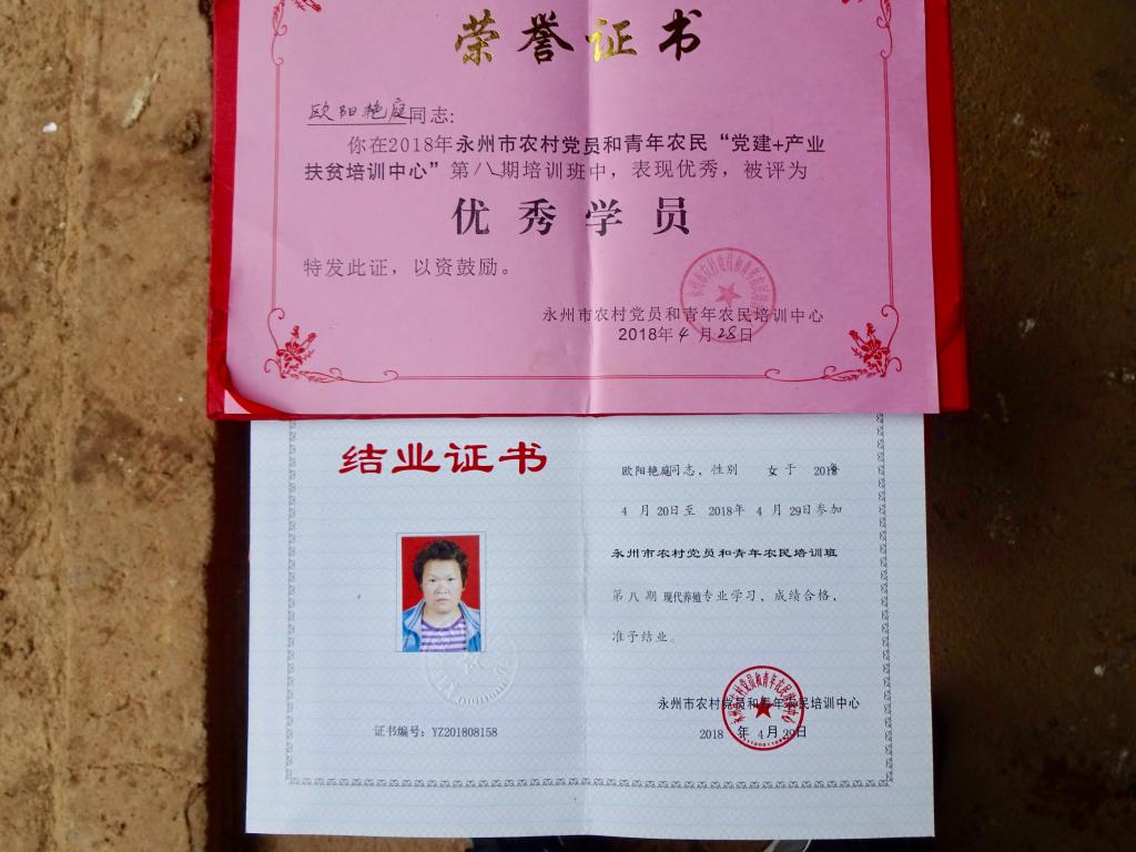 尝到甜头的王国民找到了工作队,说今年要大养特养,要成立养殖合作社,带领乡亲们共同脱贫致富。缺资金,工作队帮助申请合作社小额贷款,缺技术,通过组织部门安排他妻子欧阳艳庭到道县参加农村青年农民技术培训班。通过培训,更加坚定了欧阳艳庭走生态养殖路子的信心和决心,欧阳艳庭同时拿到结业证和荣誉证,能拿到两证全班的只有7人,在培训班结业典礼上,她自豪地说:“我虽然是个只有小学文化的农村妇女,家里的主要劳动力也是残疾,但政府有这么好的扶贫政策,在帮扶工作队的帮扶下,在老师和同学们的教诲和鼓励下,回家后,我有信心和决心办好生态养殖合作社,不但自己要脱贫,还要带领乡亲们一起脱贫致富。”