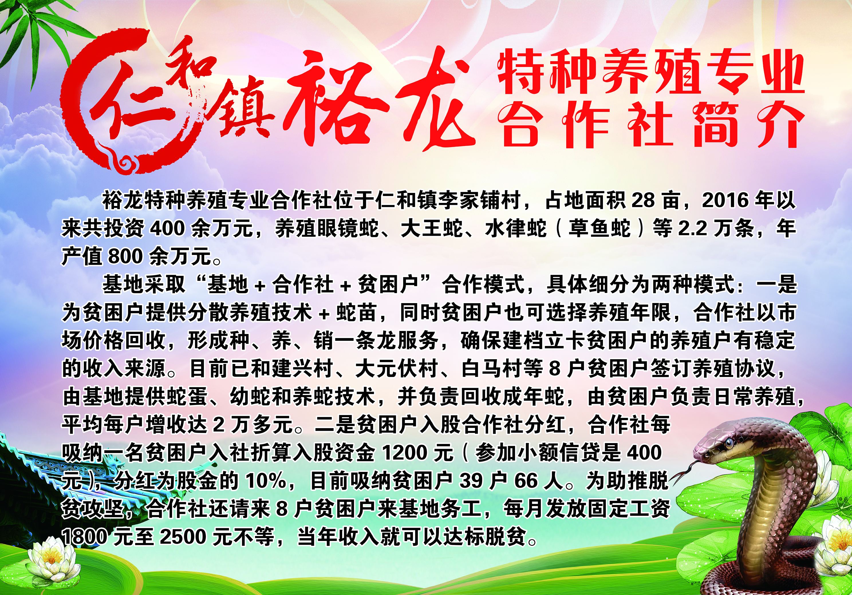 一是建立基地联动。紧紧围绕培育支柱产业这个中心,狠抓“一村一品”基地建设,逐步建立起养蛇、优质烟、水果采搞、九疑灰兔等10个农业生产基地。李家铺村两委与裕龙养蛇基地合作共投资400多万元,共养殖眼镜蛇、大王蛇(菜花蛇)、水律蛇(草鱼蛇)等2.2万条,2018年有望突破产值600万元,村集体经济增收近10万元;吸收李家铺、建兴、白马等三个村39户66人入社,并解决5名周边贫困户社员的就业岗位。