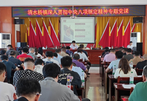 6月30日上午,清水桥镇党委主要负责人以《锲而不舍落实中央八项规定精神 以优良作风护航清水桥高质量发展》为题,为全镇干部职工和辖区村(社区)党组织书记讲授深入贯彻中央八项规定精神专题党课。