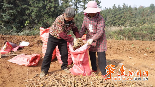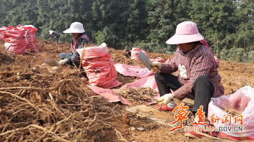 在太平镇新塘下村的中药材种植基地里,永鹏中药材种植专业合作社带头人刘永鹏带着数十名村民正在紧张忙碌地开挖虎杖。在大型机械的帮助下,成熟的金黄色虎杖根茎破土而出,没一会儿工夫,就堆成了一座小山。工人们忙着将虎杖切段、装袋、运输,一派热火朝天的丰收忙碌景象。“今年我们的虎杖喜得丰收,我每天请几十个工人采收,每亩产量达2吨,每一吨可卖1万多元。基地共种植虎杖、土茯苓、车前子达一千多亩。下一步我们会扩大种植面积,增加加工设备,带动更多周边老百姓加入我们的合作社一起种植药材,共同致富。”刘永鹏介绍道。