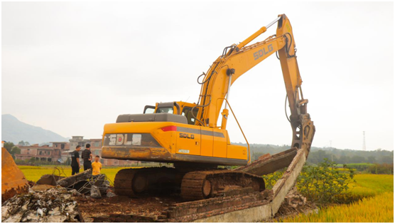 现场拆除工作稳步有序推进,在挖掘机持续的轰隆声响中,违法建筑物在挖掘机的施工作业中应声变为尘土。