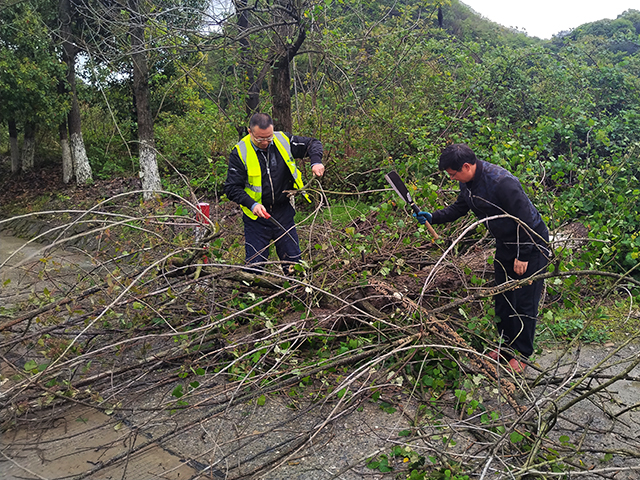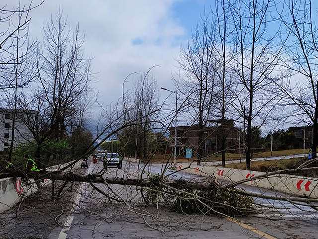 突来的狂风暴雨,导致G357线、S230线、X034线、X004线、X005线等公路两侧的行道树30多株行道树不同程度断折或倾倒,树干、树枝占据公路,造成交通受阻。乡镇(街道)、交通、交警、公路等部门保持信息共享,同发力对影响到公路安全畅通的断折、倾倒路树进行处置。因受损的路树较多,距离间隔远,本着“先保通、再保畅”的原则,当地政府应急人员和公安交警对受阻车辆引导分流,交通执法人员维护交通,公路抢险人员用油锯锯、柴刀砍、绳索拉的方式对断折、倒伏的树木进行砍伐和拉运,并对堵塞的排水设施疏通。经过4个多小时奋战,所有倒伏的路树清除完毕,公路安全畅通。