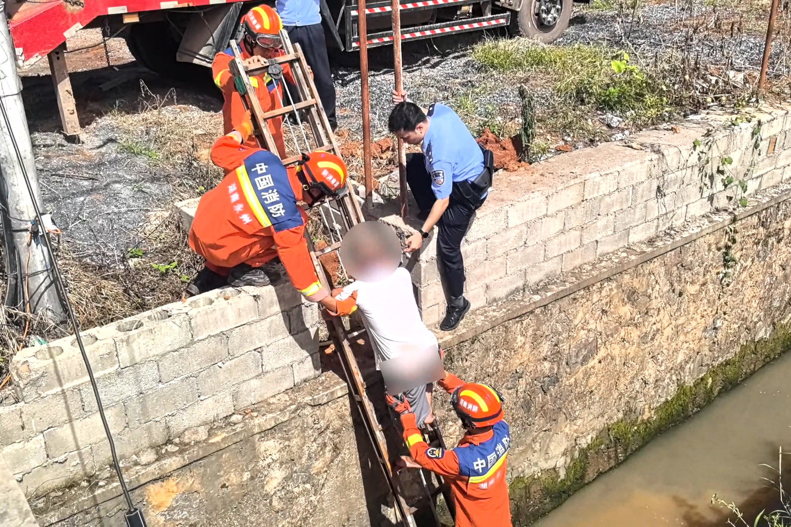 消防救援人员随即询问老人受伤情况,看到消防救援人员到来,老人这才从水中站起。一名消防员顺着沟壁下到渠中,将老人扶到水泥台上,另一名消防员搬来拉梯,搭设在水泥台上扶稳固定。老人在消防员的帮助下成功顺着拉梯上岸。