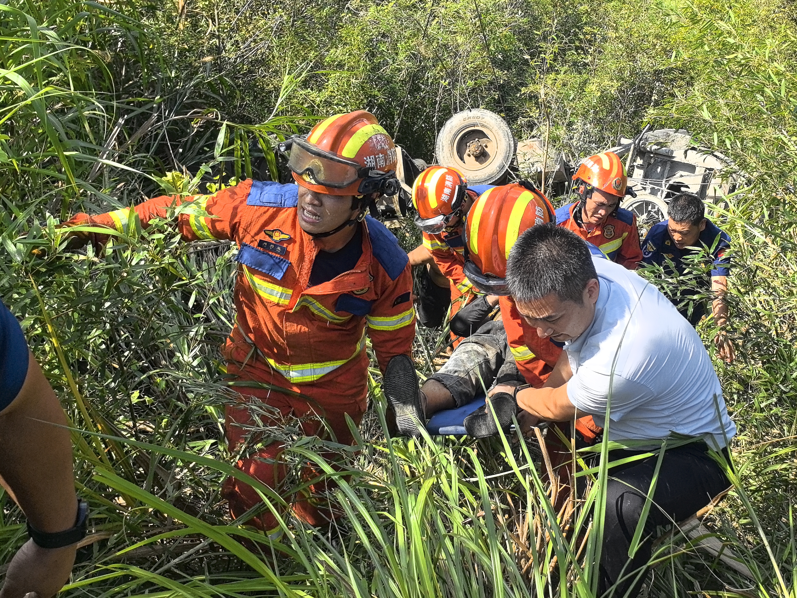 10月3日11时42分许,永州市宁远县消防救援大队接到报警称:冷水镇五马村一辆车翻下陡坡,司机被压在车下,请求救援。接到报警后,大队立即出动救援力量赶赴现场进行救援,通过吊车起吊、切割破拆等方式,成功将被困司机救出并送上救护车,整个救援过程约耗时1小时。
