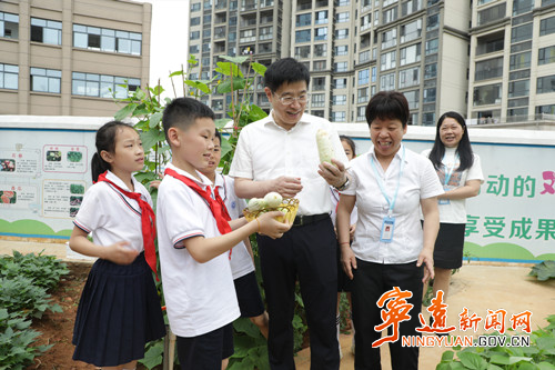 在实验小学,胡勇刚先后查看了校园环境、教学设施,参观了庆“六一”师生书画展、学校食堂,详细了解学校办学规模、教师队伍力量、校园文化建设、教学活动开展、未成年人保护等工作情况。走进学校菜园,看着孩子们在老师的引导下,正在浇水、施肥、采摘,胡勇刚走上前,认真了解学生们的生活学习情况,勉励他们要热爱劳动、好好学习。在阶梯教室,胡勇刚戴上红领巾,观看了同学们的表演,为同学们送上书包、文具等学习用品。