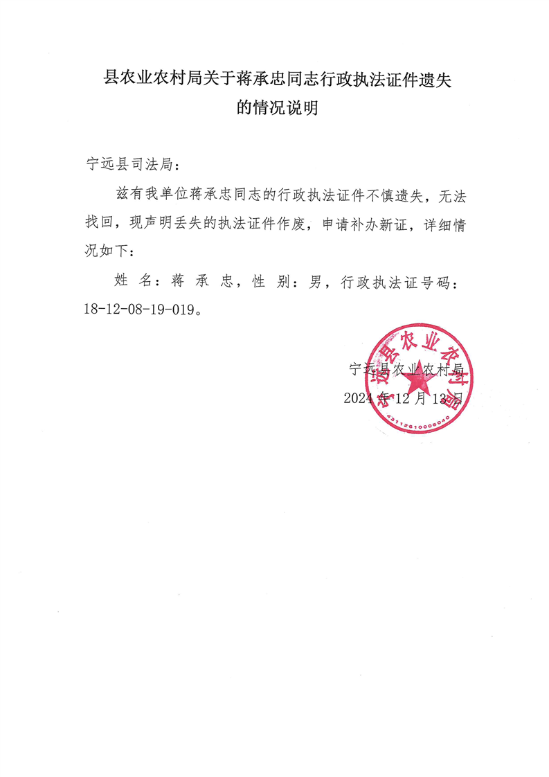 宁远县执法人员补证声明公示