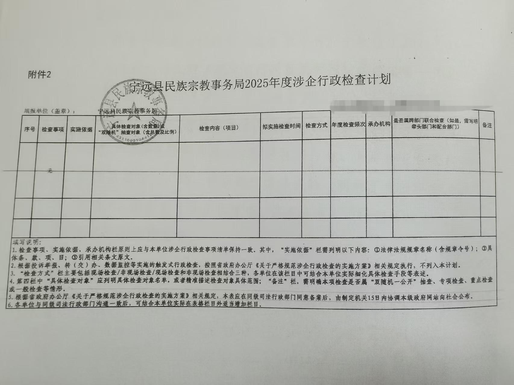 宁远县民族宗教事务局2025年涉企行政检查计划