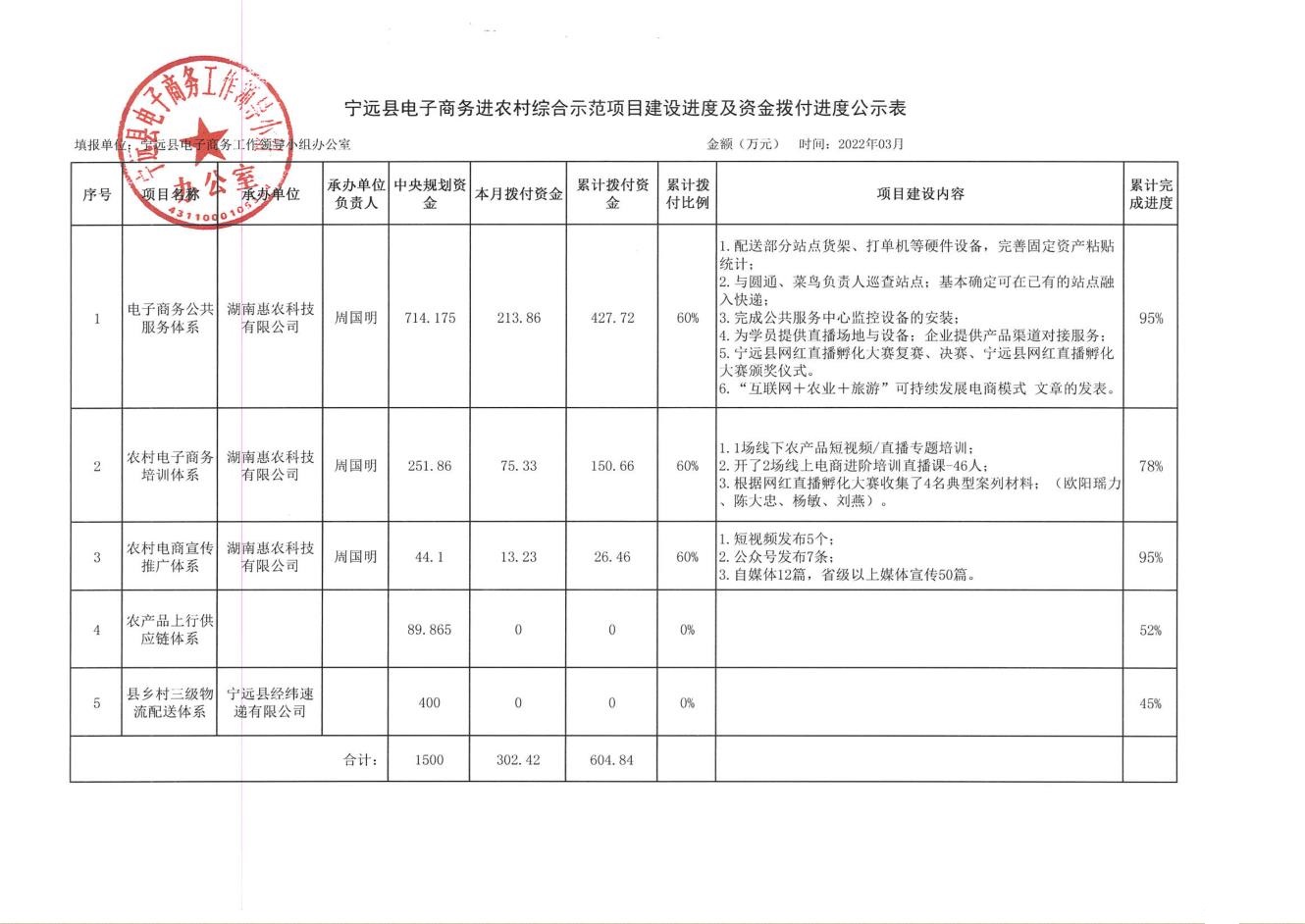 宁远县电子商务进农村综合示范项目建设进度及资金拨付进度公示表2022年3月