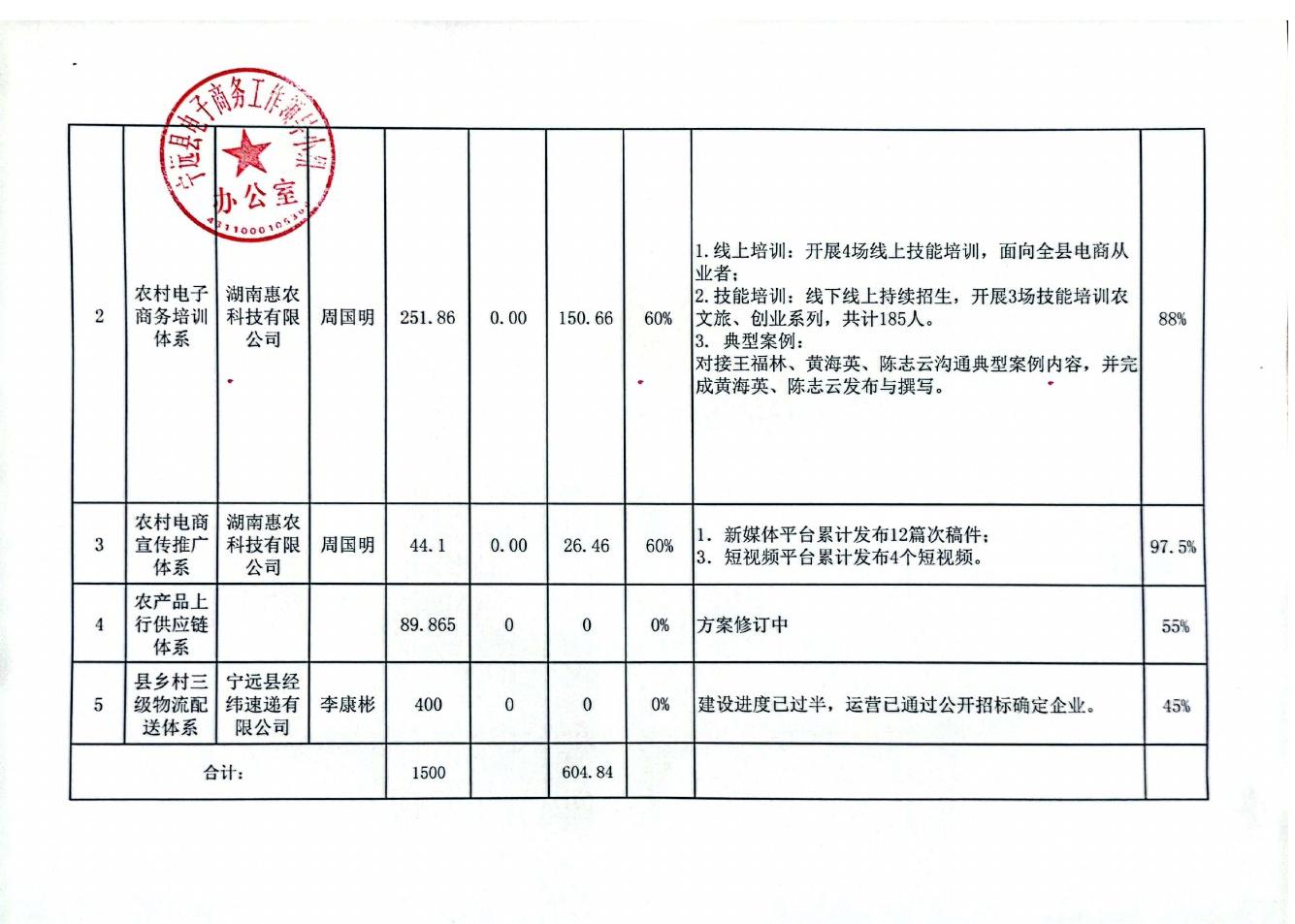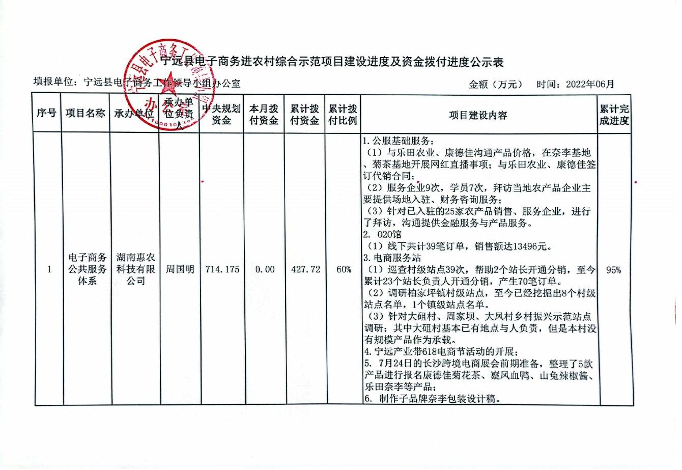 宁远县电子商务进农村综合示范项目建设进度及资金拨付进度公示表2022年6月