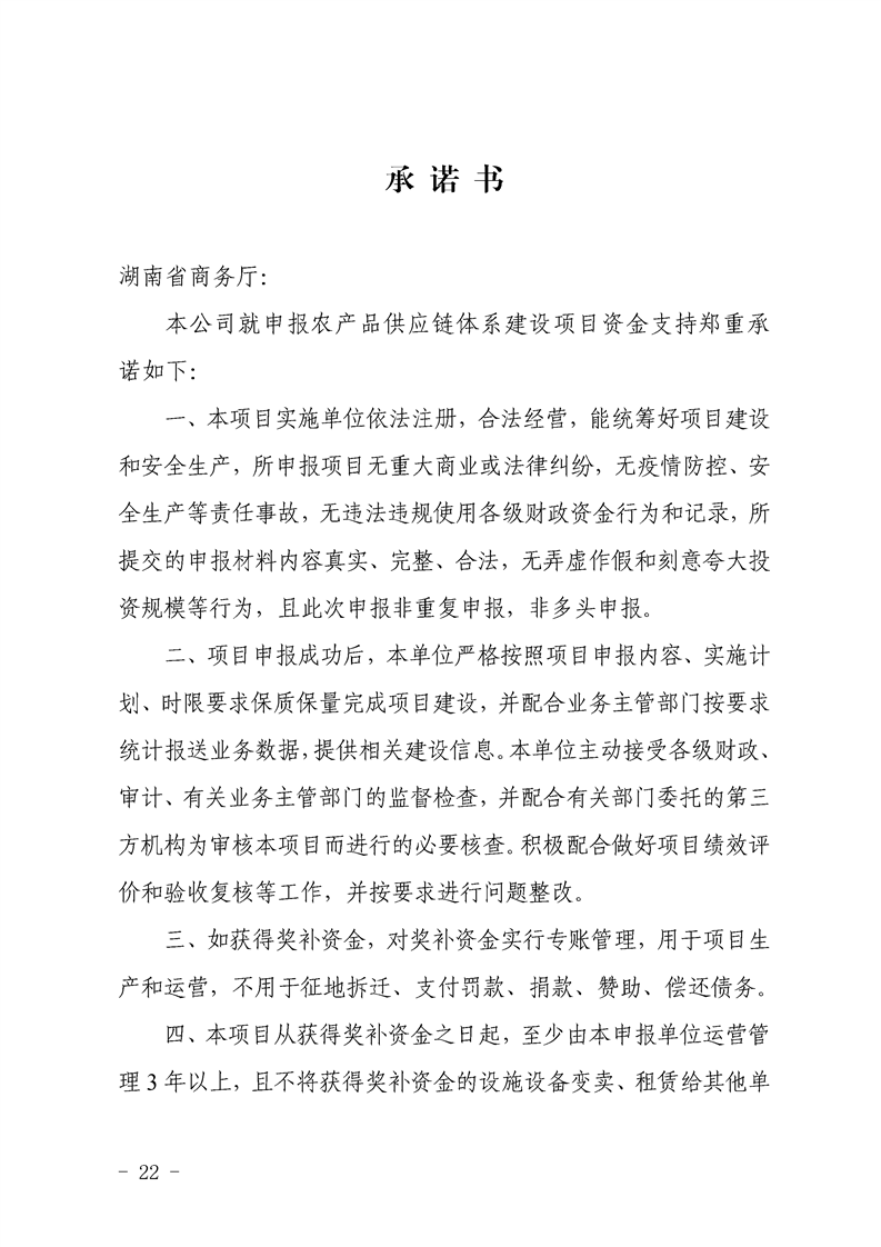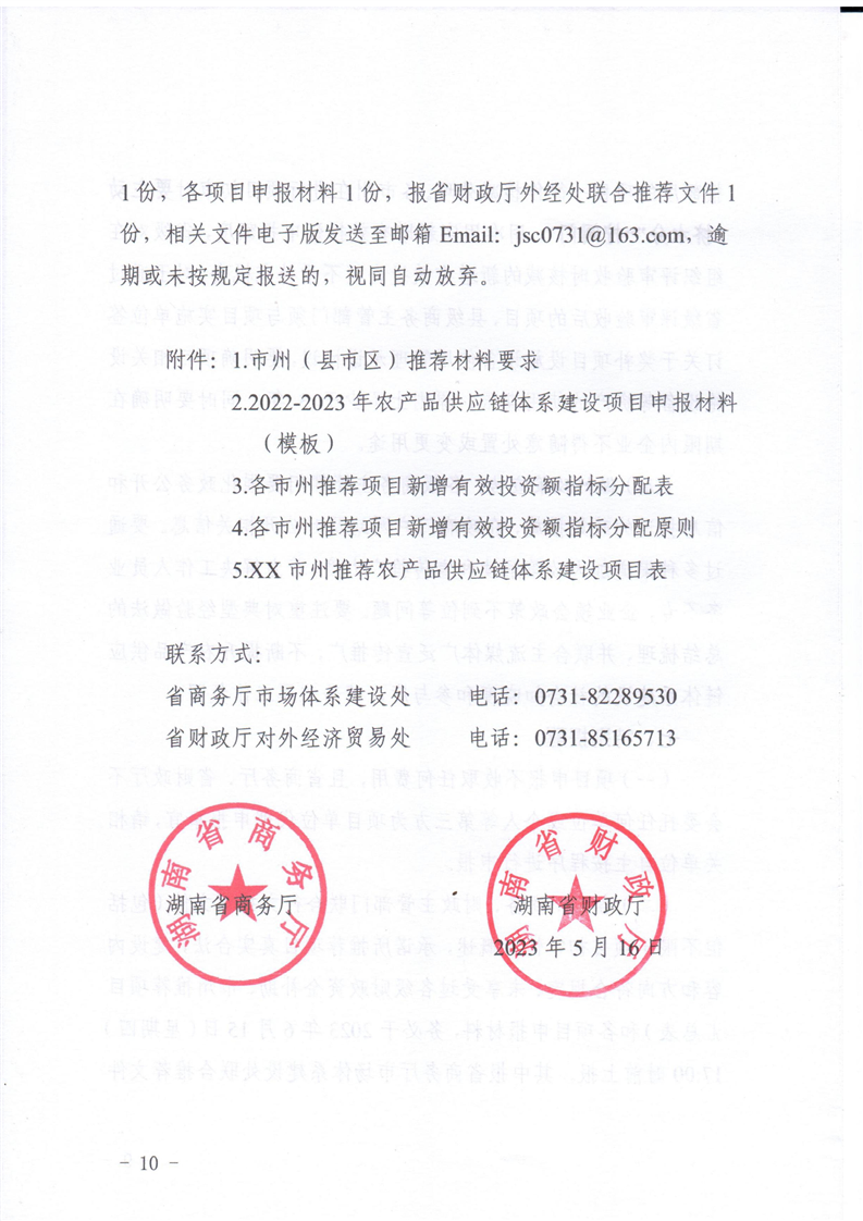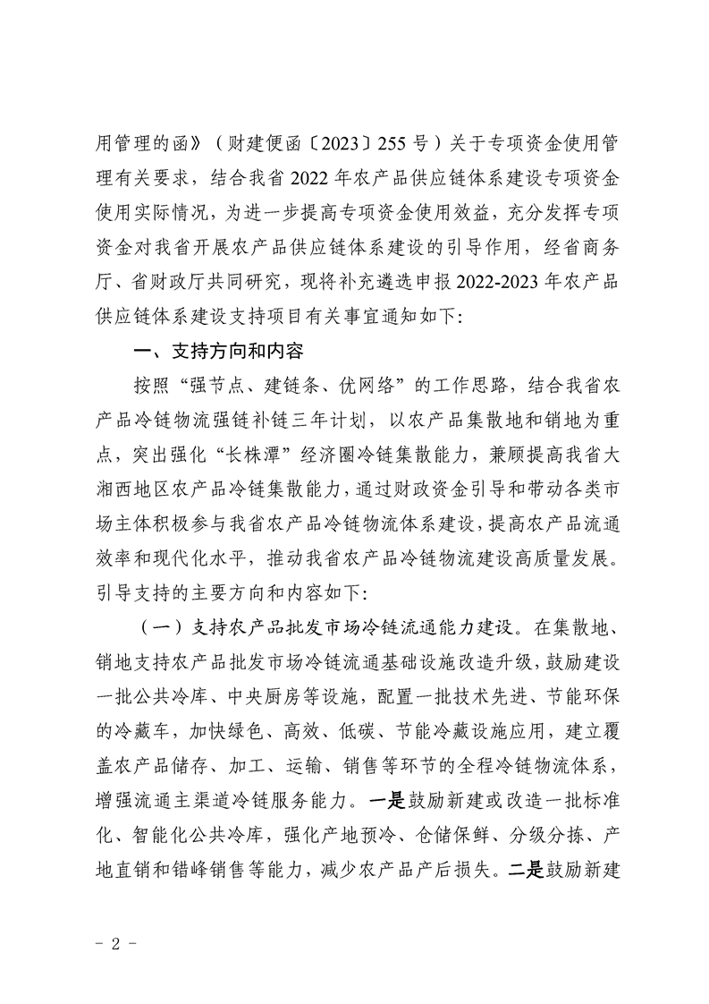 《关于补充遴选申报2022-2023年农产品供应链体系建设支持项目的通知》(湘商建[2023] 3号)