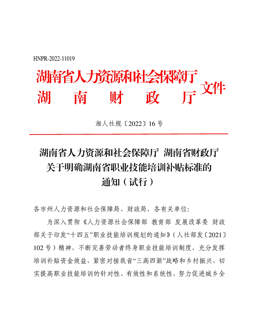 湖南省人力资源和社会保障厅 湖南省财政厅关于明确湖南省职业技能培训补贴标准的通知(试行)