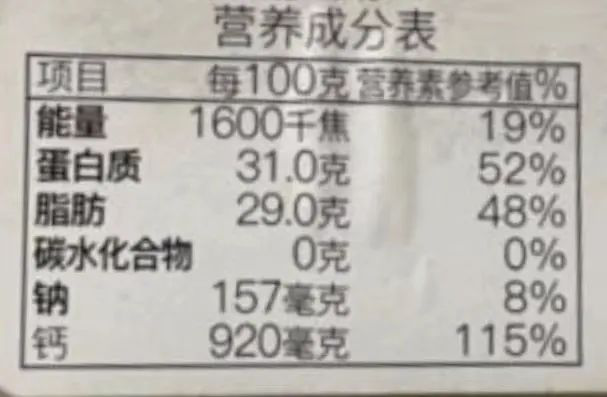 也就是营养成分表。目前法定营养标签的强制指标还不多,包括能量、蛋白质、脂肪、碳水化合物和钠,但这些指标对识别和选择奶酪足够了:这几个指标恰好是区别奶酪的关键。
