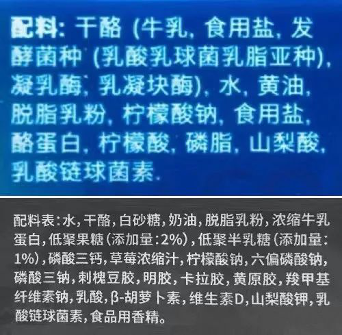 所以,即使是再制奶酪,其配料表首位也一定要是干酪,其后是水,最好是生牛乳;后面的辅料不是不可以用,但应选尽量简单的,尤其是当奶油或植物油、蔗糖或麦芽糊精等出现在配料表中,那就要注意上面谈的营养标签中的指标了。