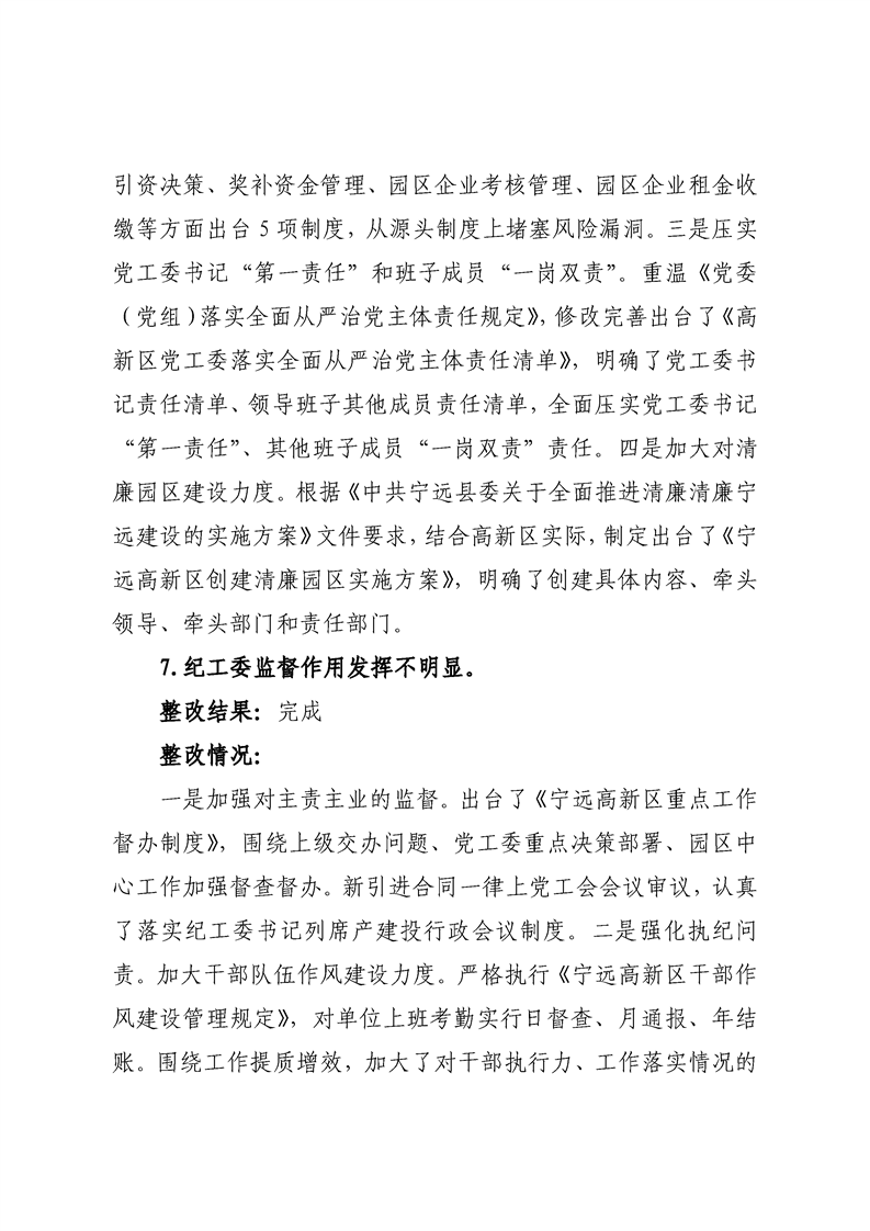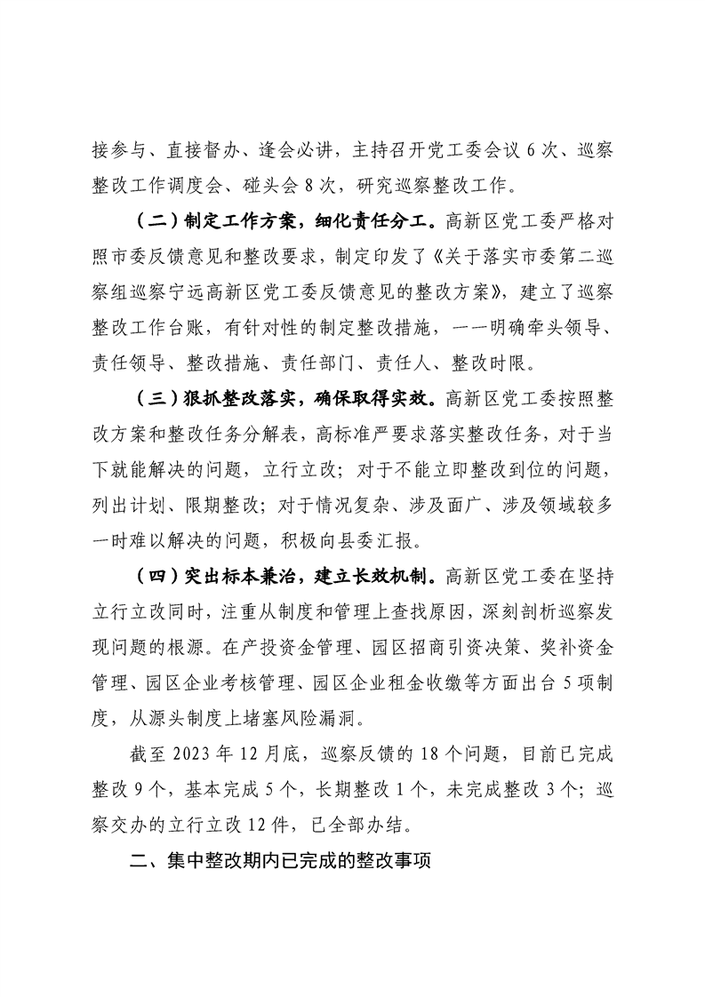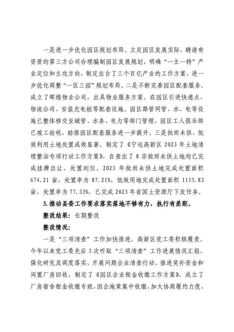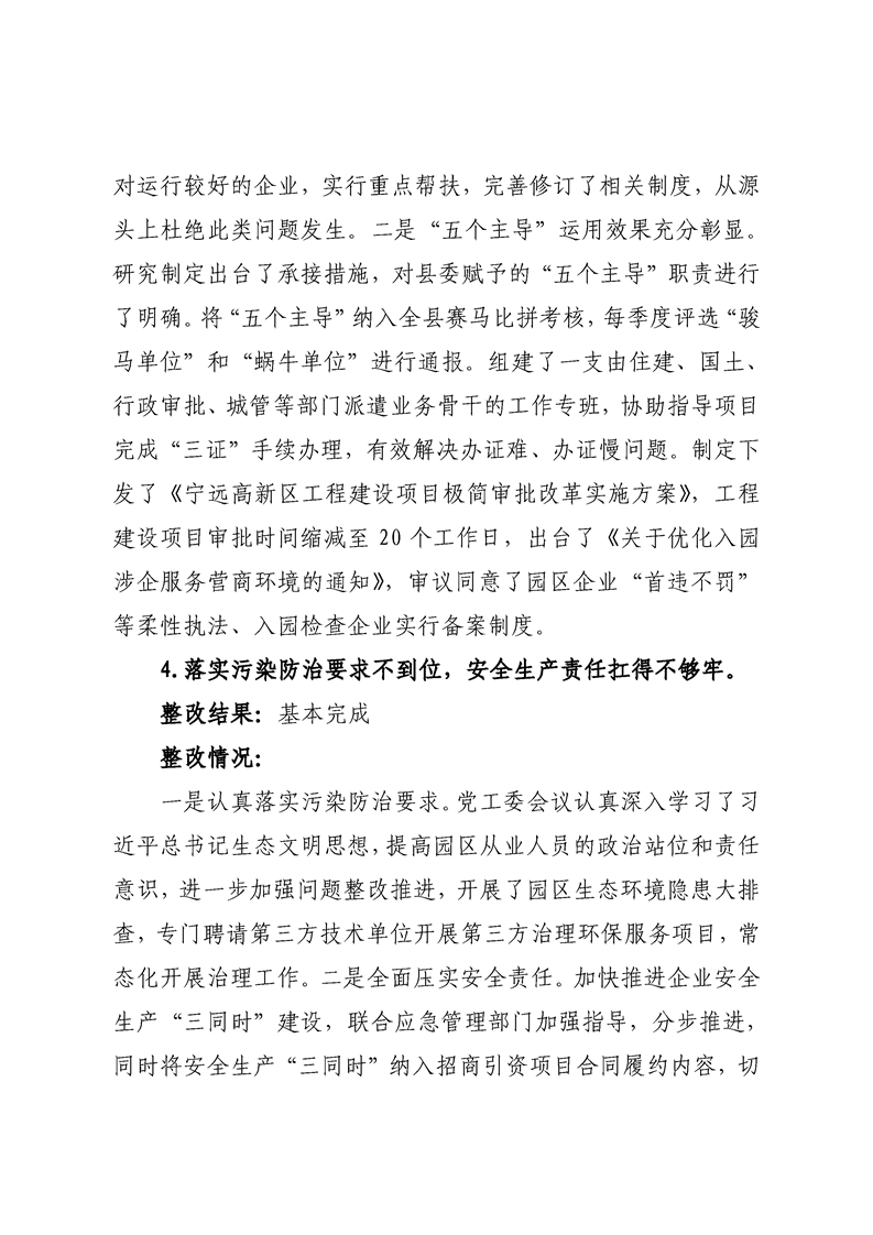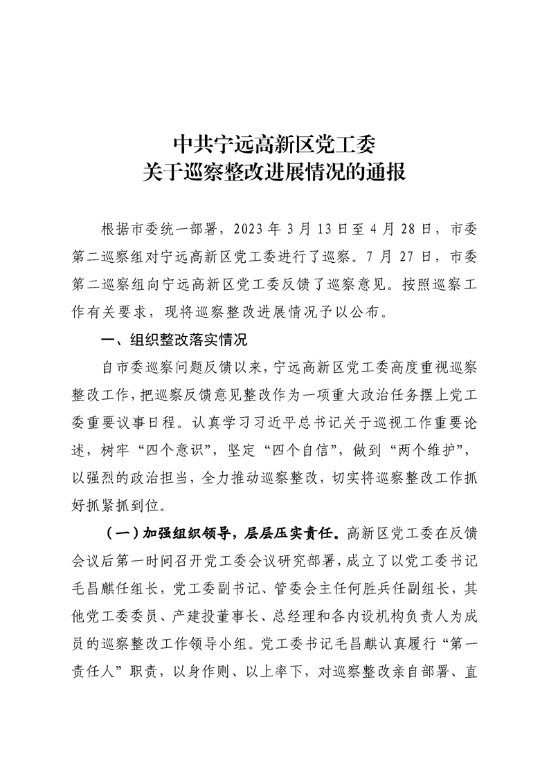 中共宁远高新区党工委关于巡察整改进展情况的通报