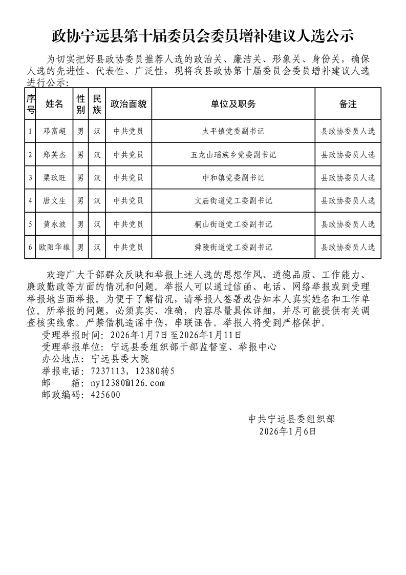 政协宁远县第十届委员会委员增补建议人选公示