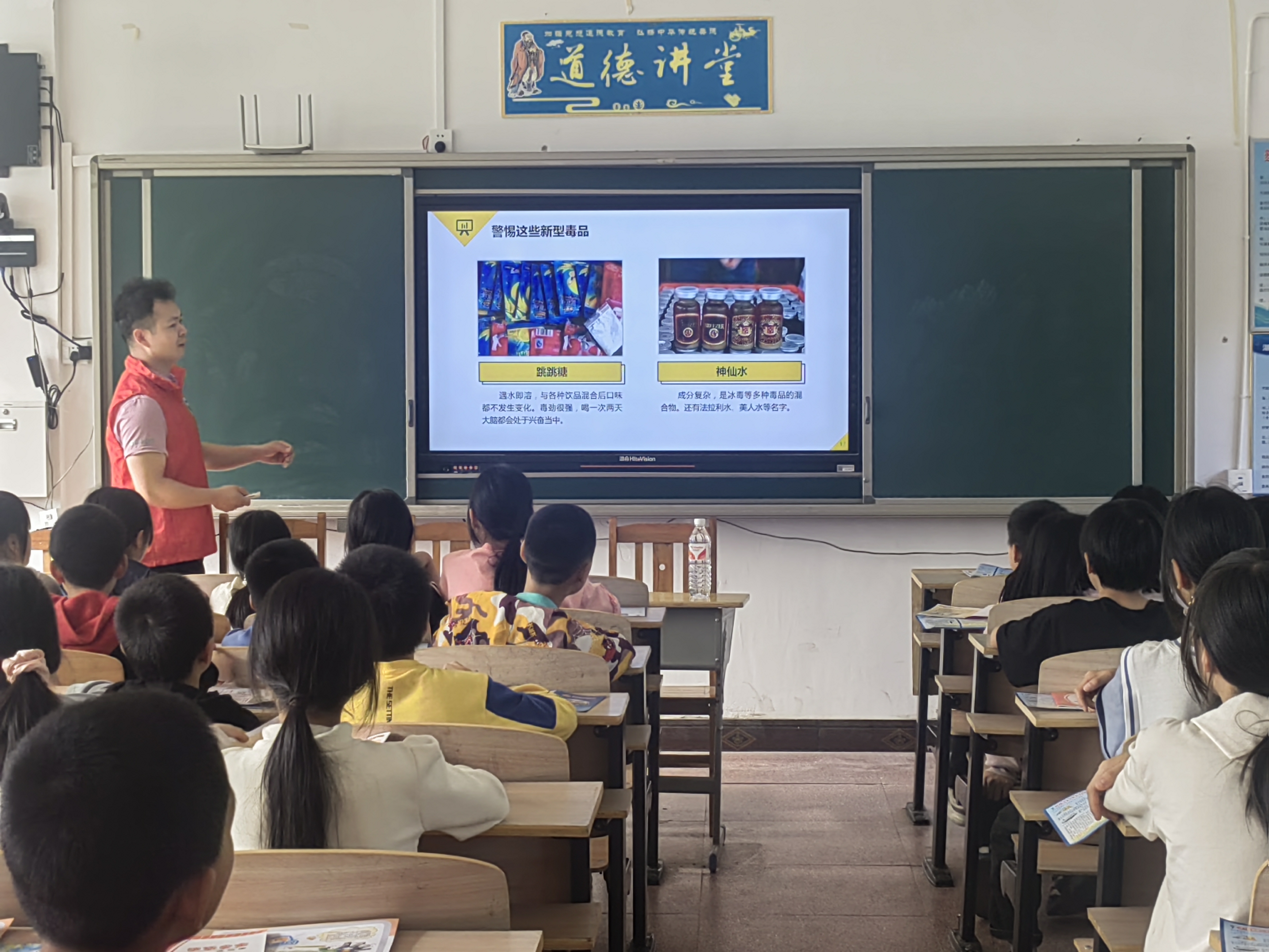 课堂上,团委工作人员现场发放未成年人保护、预防毒品和防范电信网络诈骗知识手册,司法所长结合自身所见所闻所感,采取互动式教学,领学《中华人民共和国未成年人保护法》,引导学生正确认识性侵害,运用合理手段保护自身安全;综治中心主任通过介绍新型毒品类型和电信诈骗常见套路,组织观看禁毒反诈警示教育片,告诫在场学生要增强自我防范意识,远离含依托咪酯成分的电子烟,不轻信陌生来电和信息;随后,教导主任带领学生庄严宣誓,倡导大家远离毒品和电诈,勇于拿起法律武器制止性侵害。