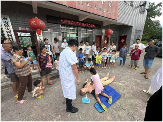 该镇防溺办以四方联动集中宣讲为契机,联合卫生院、派出所等部门在先锋村包家水坝旁开展防溺水应急演练活动。活动中,卫生院医护人员以模拟假人为教具,演示“溺水者上岸后如何判断意识与呼吸”“胸外按压的位置、深度和频率”“人工呼吸的正确操作方法”等关键步骤,尤其强调“未成年人严禁下水救人”“救援时要趴在岸边,用竹竿、衣物等延长救援距离”等安全原则。“按压时要双手交叉,掌根放在两乳头连线中点,垂直用力,每分钟至少100次……”医护人员一边讲解,一边让在场的学生、村干部和家长轮流上前实操,及时纠正动作偏差。