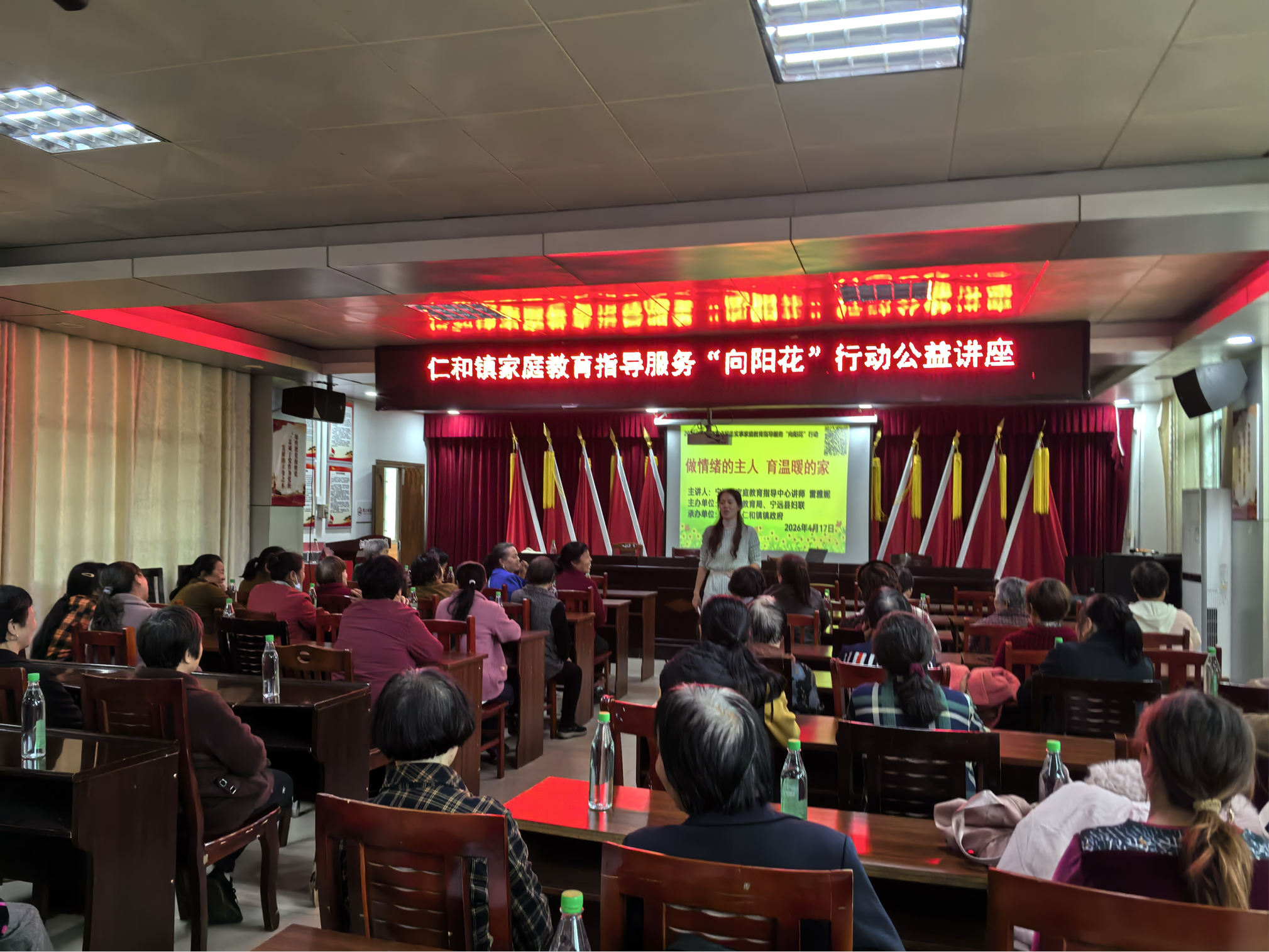 4月17日,由县教育局、县妇联主办,仁和镇政府承办的家庭教育指导服务“向阳花”行动专题讲座在镇政府二楼会议室举行,40名家长参加。