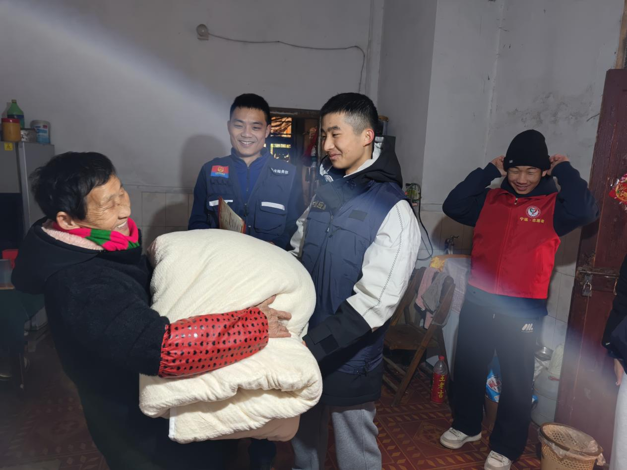 随后,宣传小队来到另一位独居老人家中,在讲解冬季用火用电安全的同时也给老人送上了棉被等过冬物资。在提及火灾报警方式时,老人指向屋内安装的独立式光电烟感报警器,消防人员随即对其功能和使用进行说明。离开前,队员还专门检查了报警器是否运行正常。