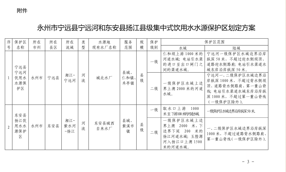 根据《湖南省人民政府关于公布湖南省县级以上地表水集中式饮用水水源保护区划定方案的通知》(湘政函【2016】176号),《湖南省生态环境厅关于永州市宁远县宁远河等2处县级集中式饮用水水源保护区划定方案的复函》(湘环函〔2021〕119 号)和《湖南省生态环境厅关于撤销永州市宁远县潇水泠江河饮用水水源保护区的复函》(湘环函【2021】369号),现公示宁远县县级集中式饮用水水源保护区划定方案: