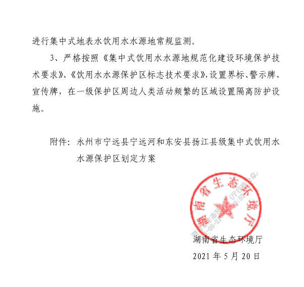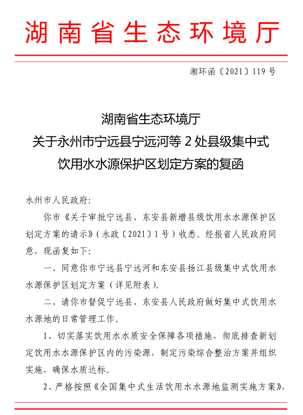 《湖南省生态环境厅关于永州市宁远县宁远河等2处县级集中式饮用水水源保护区划定方案的复函》