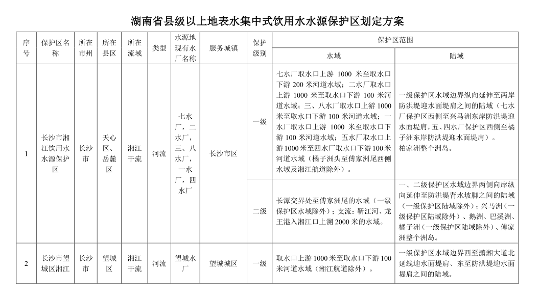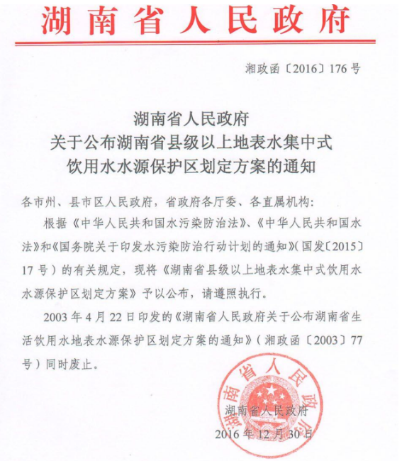 《湖南省人民政府关于公布湖南省县级以上地表水集中式饮用水水源保护区划定方案的通知》