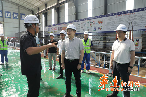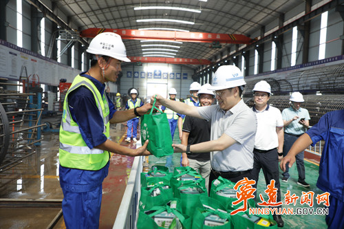 在桂新高速宁远鲤溪路段钢筋加工场,胡勇刚走进生产车间,详细了解了项目建设进展,有无遇到什么困难,需要解决什么问题,并给一线工人代表送去防暑降温慰问品,向广大建设者不畏酷暑、坚守岗位、加快推进项目建设所付出的辛勤劳动表示感谢。