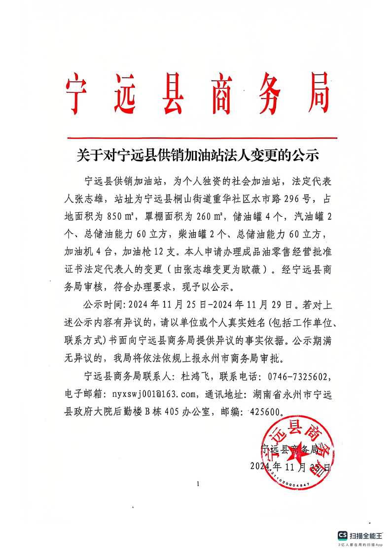关于对宁远县供销加油站法人分变更的公示