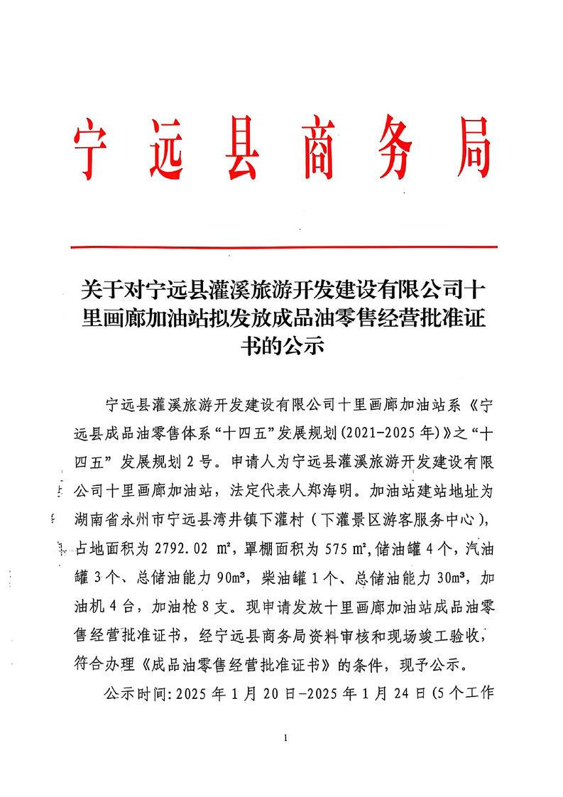 关于对宁远县灌溪旅游开发建设有限公司十里画廊加油站拟发放成品油零售经营批准证书的公示