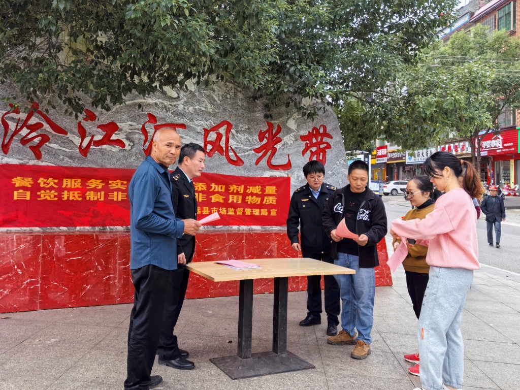10月23日,宁远县市场监管局在县城泠江河风光带广场开展了“餐饮服务实施食品添加剂减量自觉抵制非法添加非食用物质”的宣传活动,通过发放宣传单的方式,向广大消费者详细讲解了餐饮环节食品添加剂使用的相关知识以及非法添加非食用物质的危害,广泛宣传食品添加剂减量及抵制非法添加的重要性,以期增强社会公众的食品安全意识。