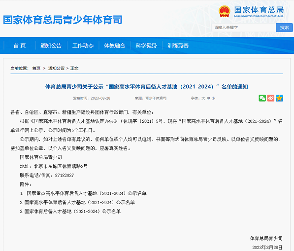2023年8月28日,国家体育总局青少司公布了《体育总局青少司关于公示“国家高水平体育后备人才基地(2021-2024)”名单的通知》。宁远县体校入选国家体育后备人才基地(2021-2024),这是该县体育工作继2021年获评“2017-2020年全国群众体育先进单位”、2022年获评全国首批“全民运动健身模范县”后连续3年获“国字号”牌子和荣誉。